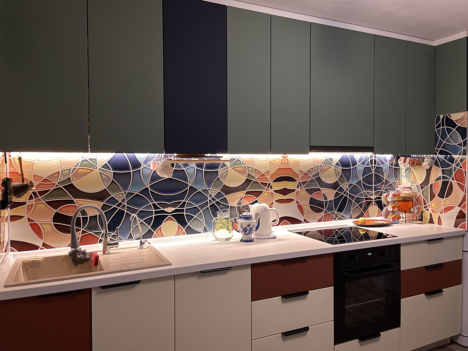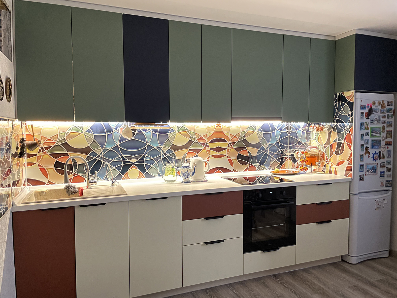 Прямая кухня с ярким фартуком