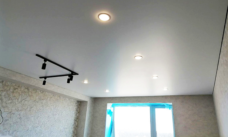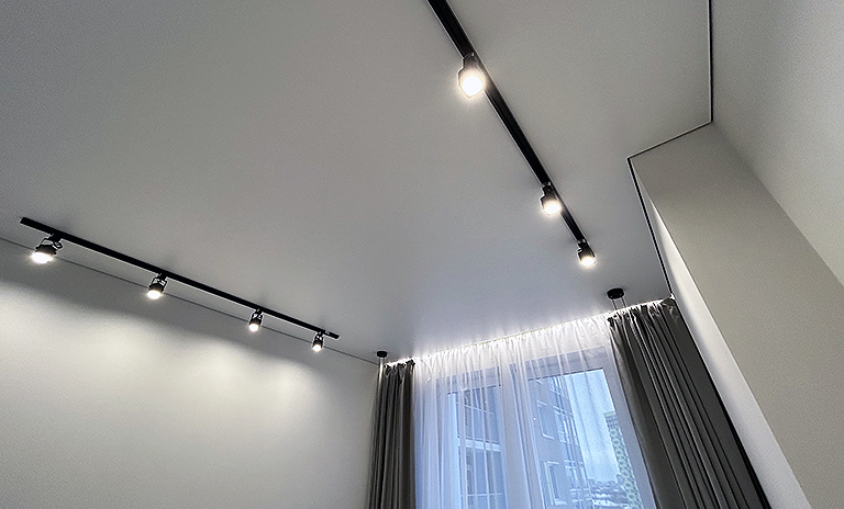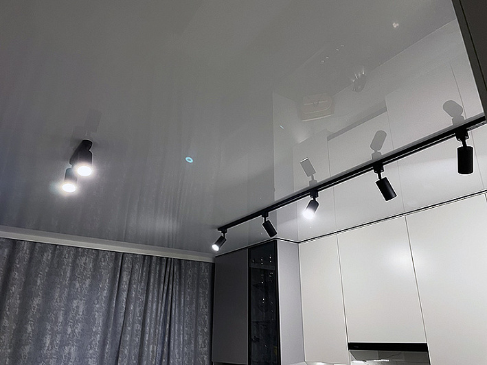 Глянцевый натяжной потолок с трековой системой